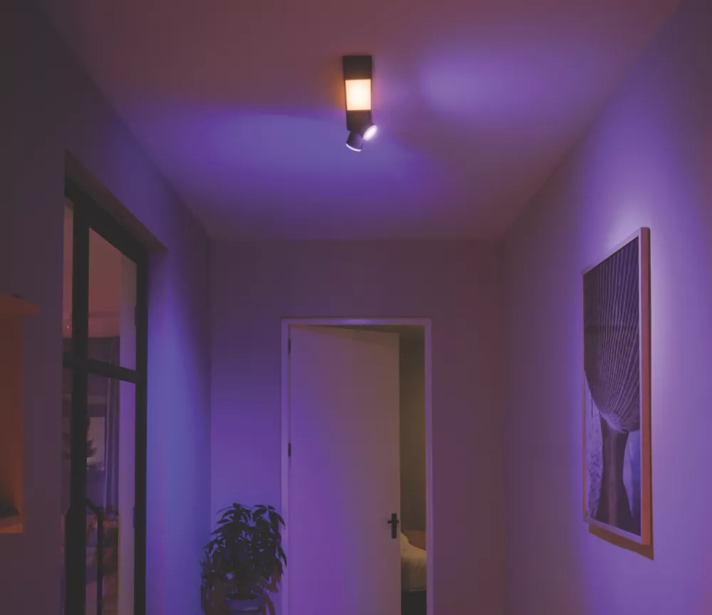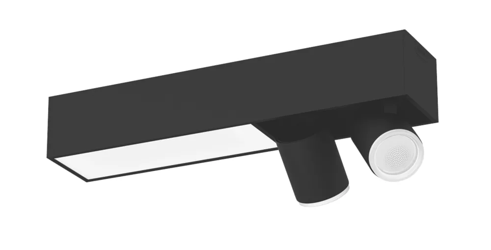 Aluminium body with thermoplastic diffuser. Contemporary design combines a fixed, diffused ceiling light with 2 spot lights that can be individually angled. Controlled via the Philips Hue Bluetooth app. Add the Hue Bridge to unlock more options (sold separately).