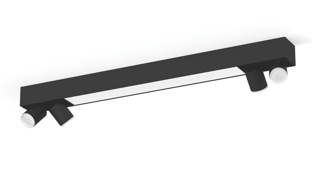 Aluminium body with plastic diffuser. Contemporary design combines a fixed, diffused ceiling light with spot lights that can be individually angled. Controllable via the Philips Hue Bluetooth app. Choose from 16 million colours to create the perfect ambiance for any mood.