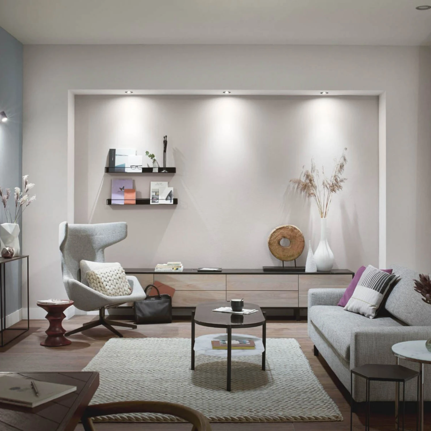 The spotlight is controlled by voice command or with a Hue dimmer switch. With app control, you can choose between direct control via Bluetooth or integration via ZigBee bridge. With the Hue Bluetooth app, up to ten lights can be controlled simultaneously, dimmed and switched to various pre-installed scenes. For the full range of functions or when using more than ten luminaires and lamps, the ZigBee variant is the best choice. Here, the Centura LED recessed spotlight is integrated into an existing smart home system with a suitable bridge, such as the Philips Hue Bridge. In this way, for example, schedules, control from on the road or the integration of the LED recessed spotlight in automations are possible.