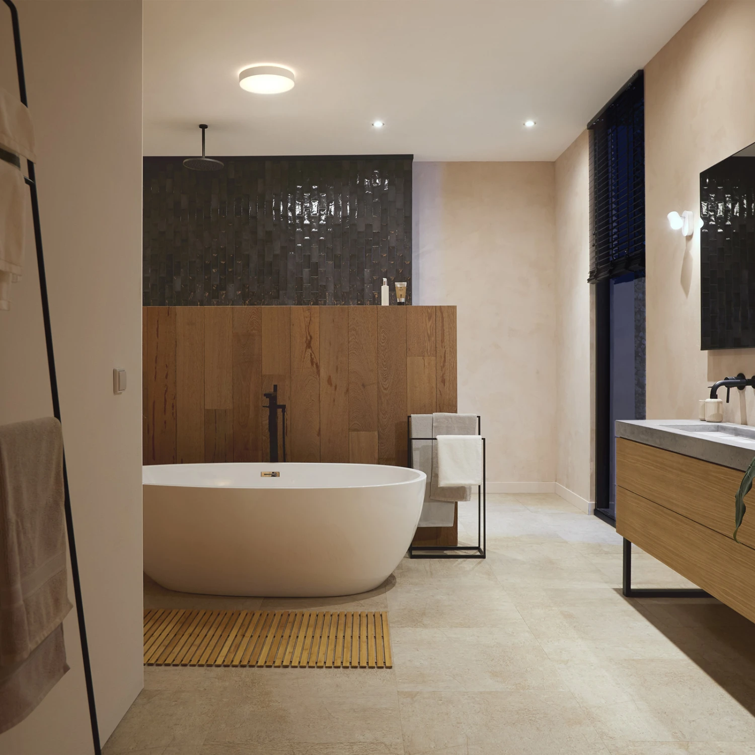 Controlled is the splash-proof ceiling light according to preference. The included dimmer switch allows switching, dimming and selecting predefined light scenes. Directly via Bluetooth, the Hue Bluetooth app on the tablet / smartphone can also be used for precise control of the light color and a selection of numerous scenes. The whole world of smart lighting control, such as integration into an existing smart home system, remote control with the Hue app or voice control, opens up with the integration via Hue Bridge.