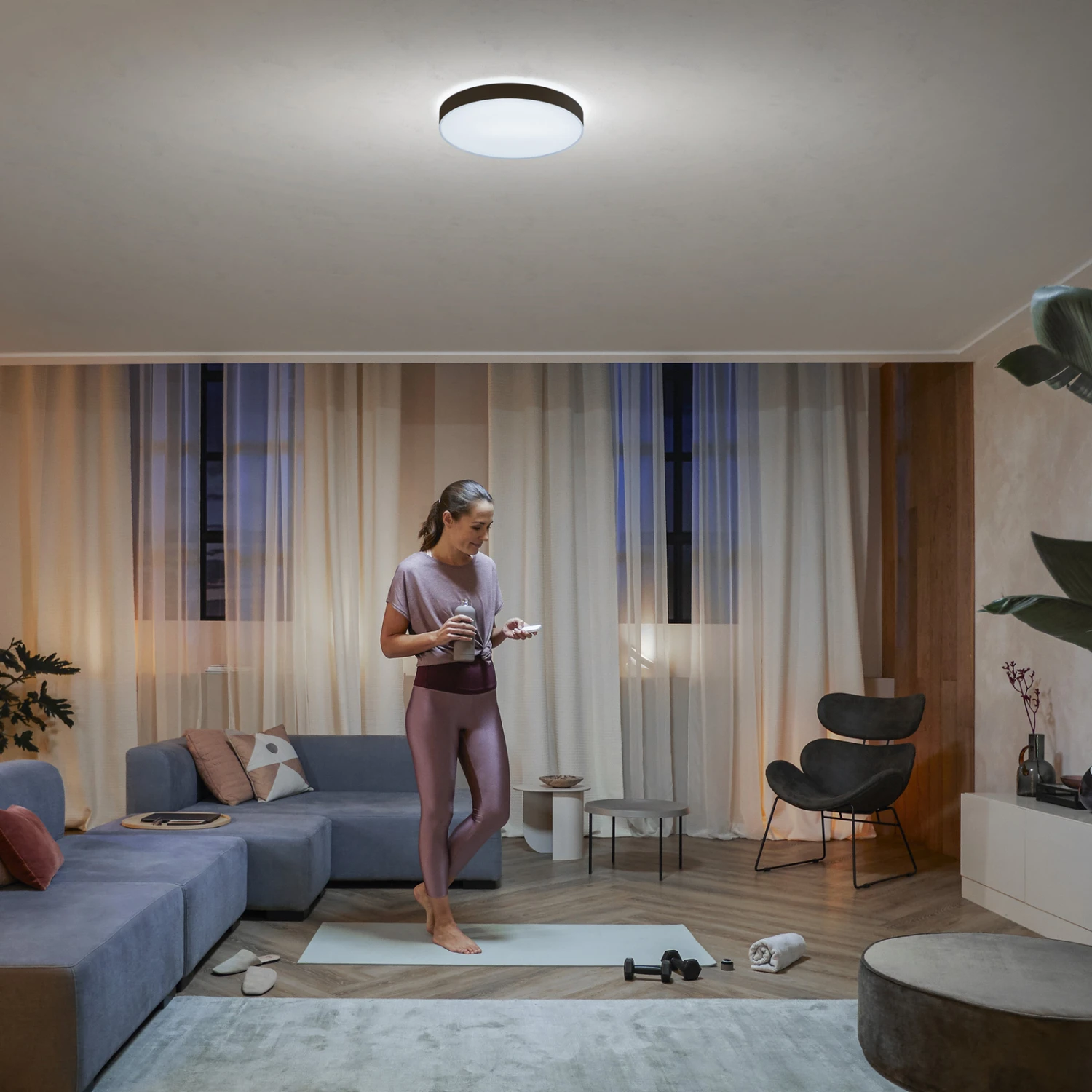 The round LED ceiling light Hue Enrave offers bright, large-area light. Whether living room, hallway or even sleeping area, Enrave offers adjustable brightness and white tones in the spectrum from warm white to daylight at any time of day the right light. Thanks to the included dimmer switch, the ceiling light can be directly switched on and off as well as dimmed. Alternatively, the light can also be controlled via Bluetooth with your own smartphone, without the need for additional devices. A smart integration into an existing Philips Hue smart home system via the Hue Bridge (see accessories) is also possible.