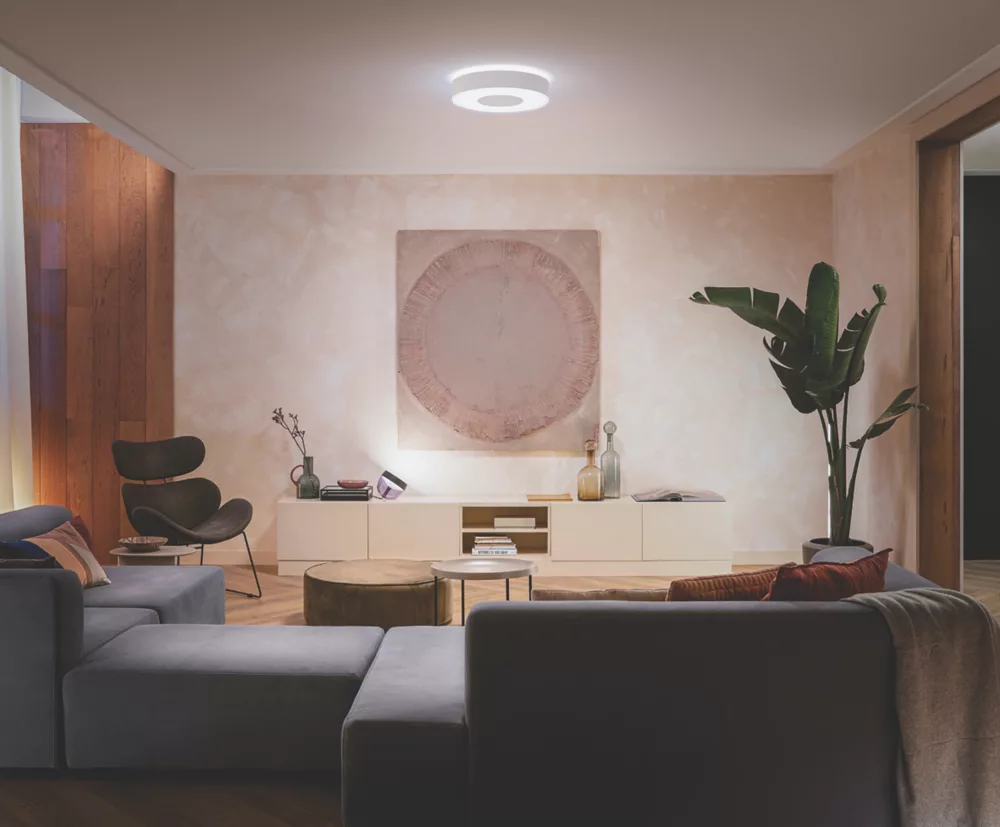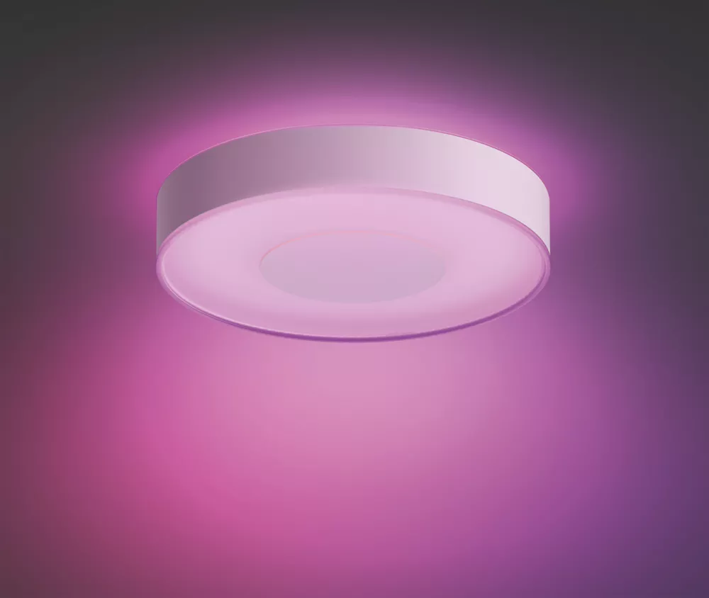 Fills the space with powerful light while casting a subtle glow onto the ceiling. Colour settings can be changed using the Philips Hue app. Compatible with Hue Bridge (sold separately).