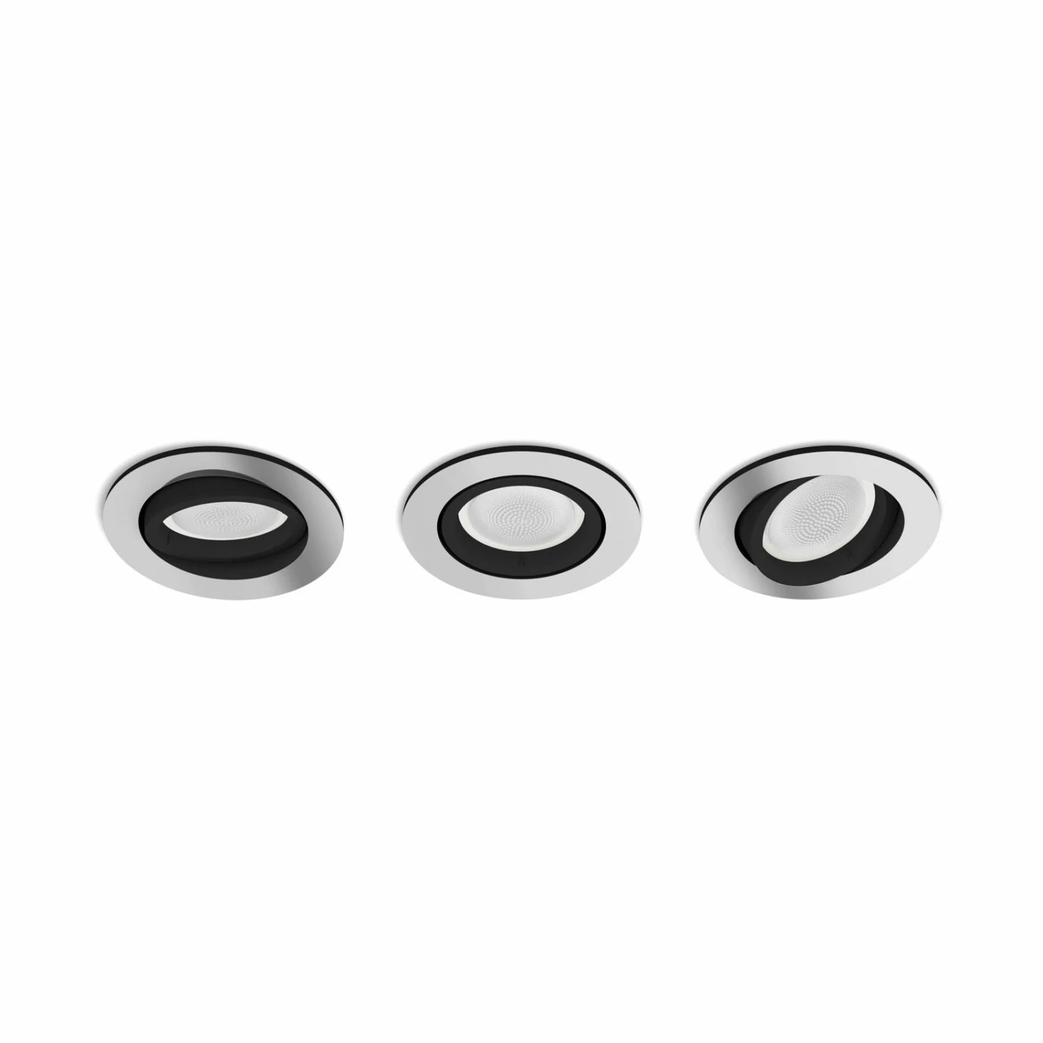 The modern, round LED recessed spot Milliskin from the Philips Hue product family is equipped with a smart controllable light source. This is located in an all-round swivelling lamp head and offers variable brightness and colour temperature.