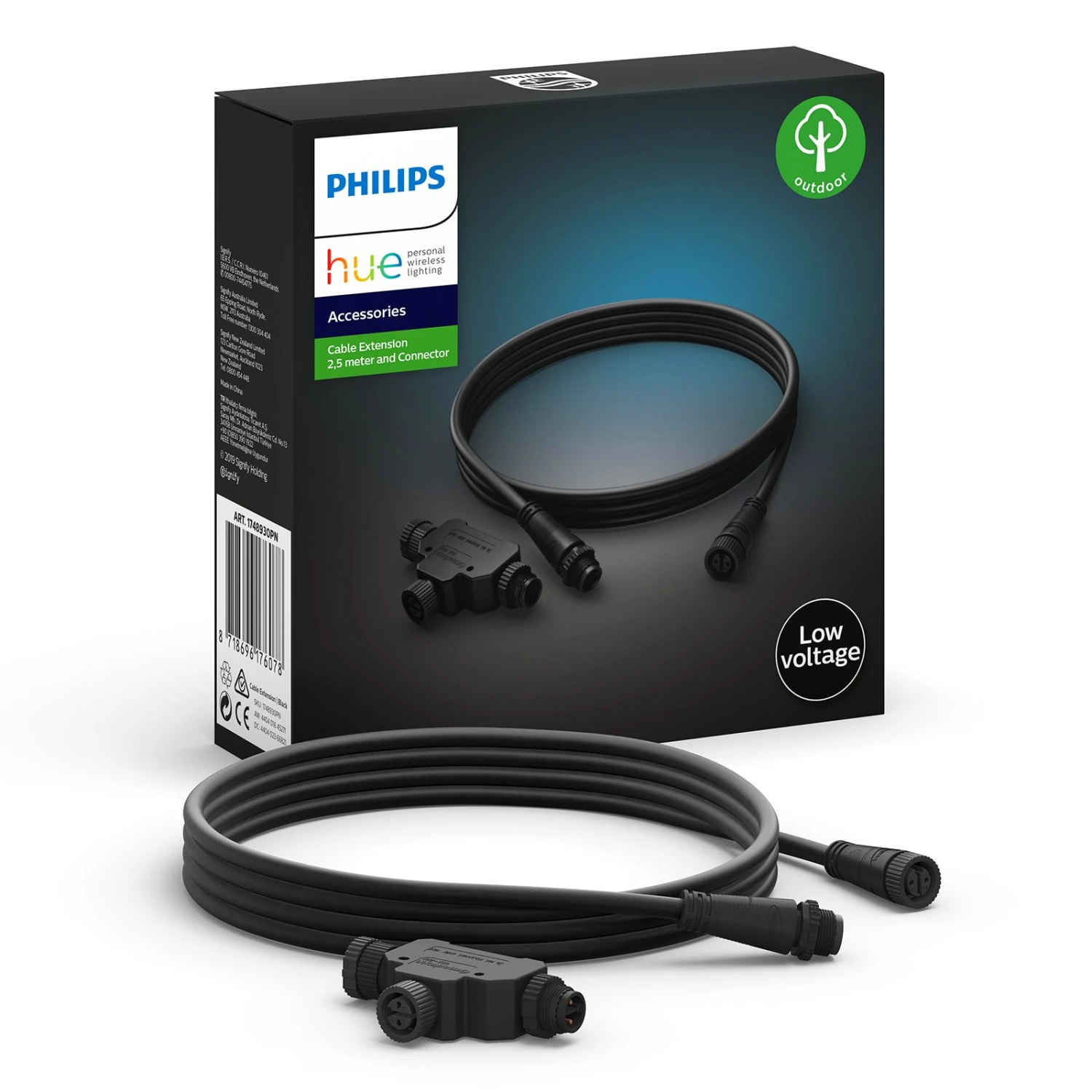 With the help of this low-voltage extension cable, Philips Hue Outdoor lights can be conveniently extended and lengthened. The cable length is 2.5 meters. Delivery includes T-piece.