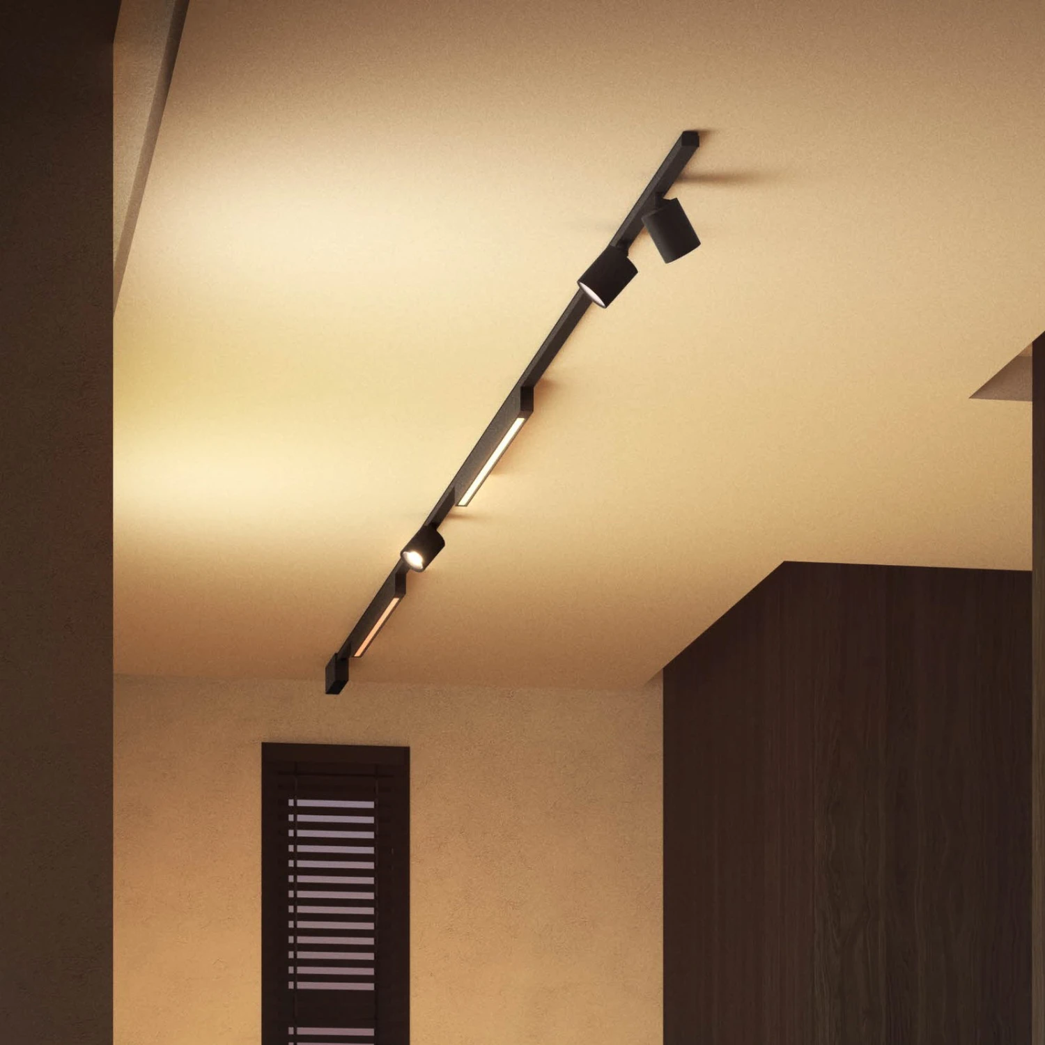 The rail system Perifo from Philips Hue is equipped with everything you need for installation. Included are 3 LED spots, a lightbar, two rails (1m and 1.5m) and a power supply to be mounted between the rails. The system can be easily expanded to create effective and modern controllable ceiling lighting.