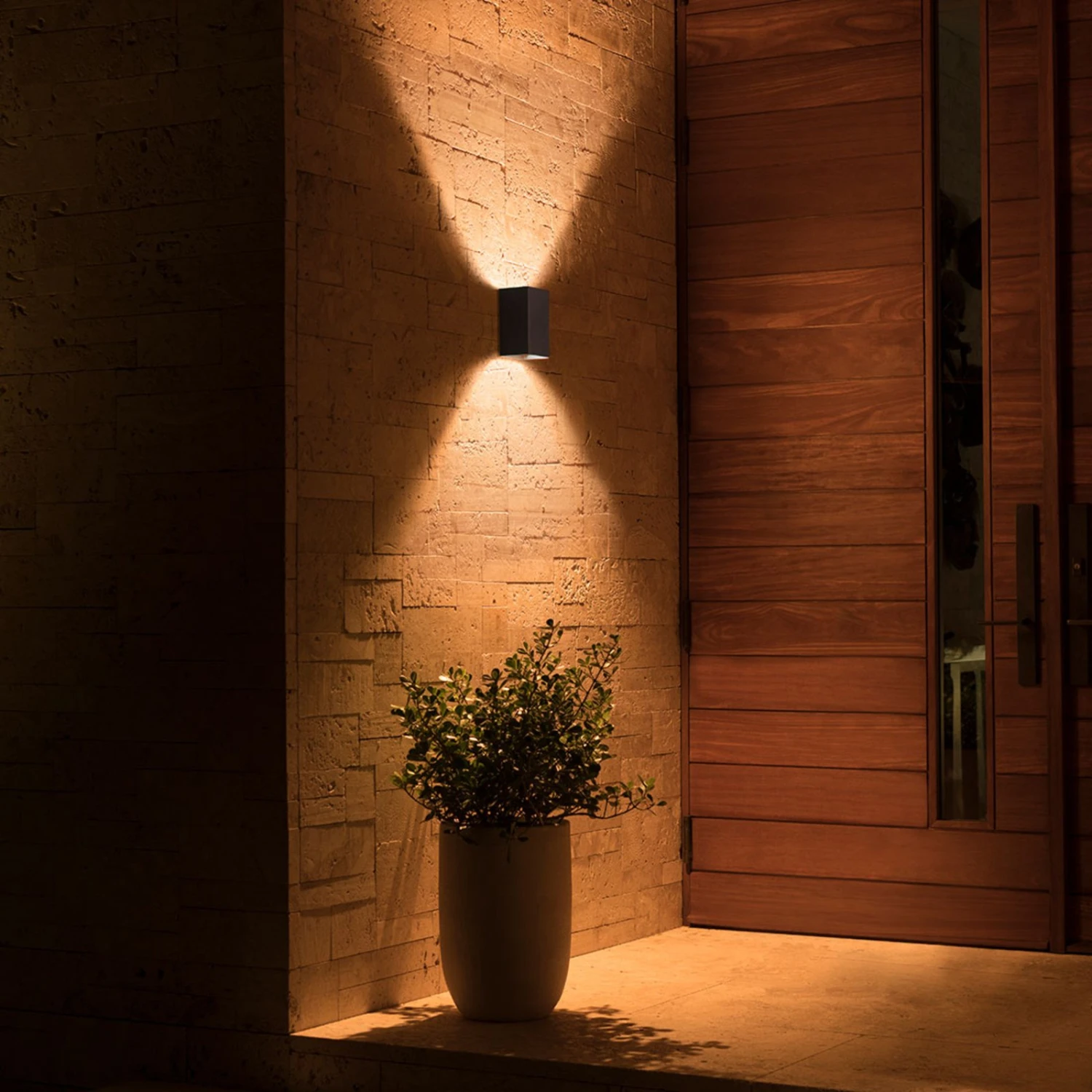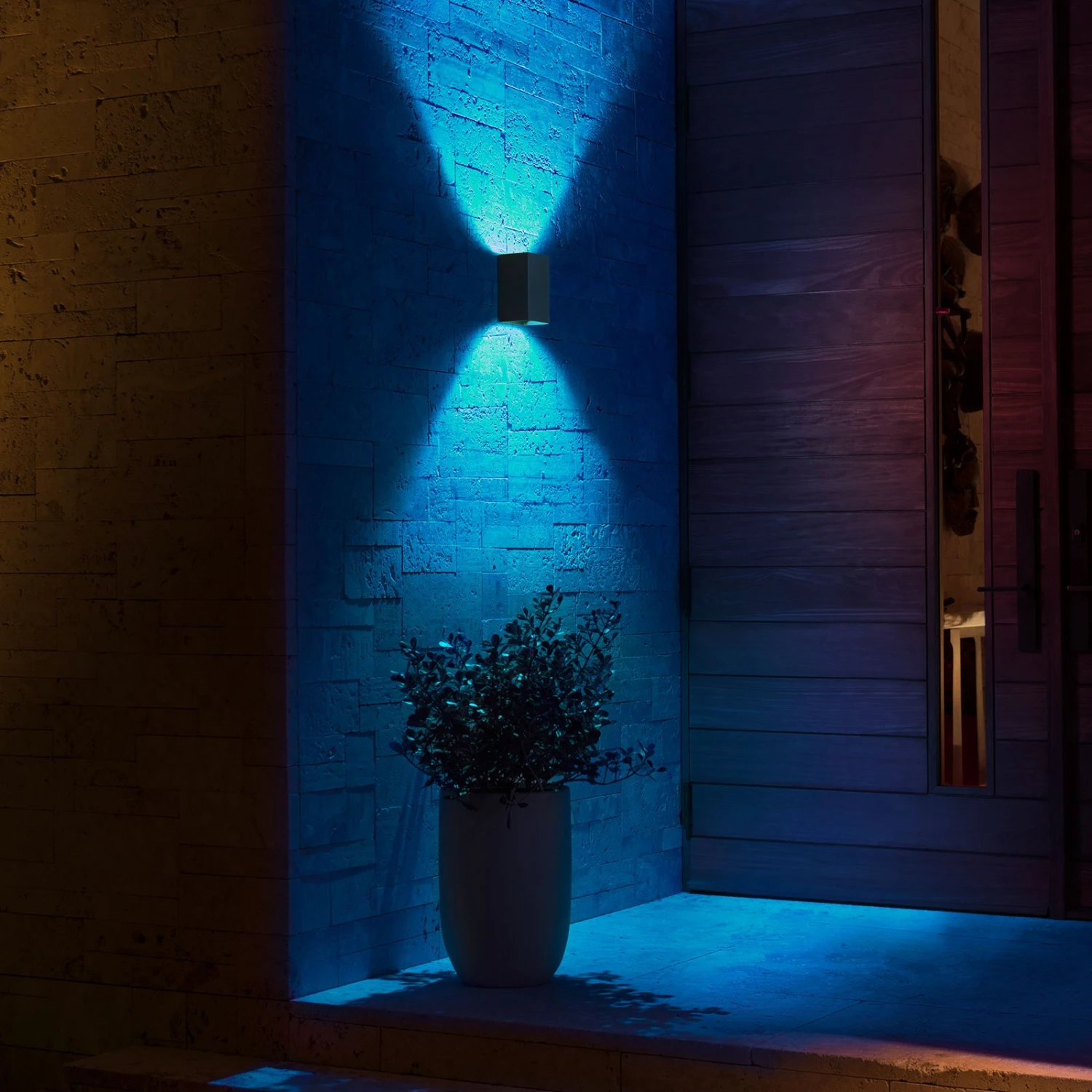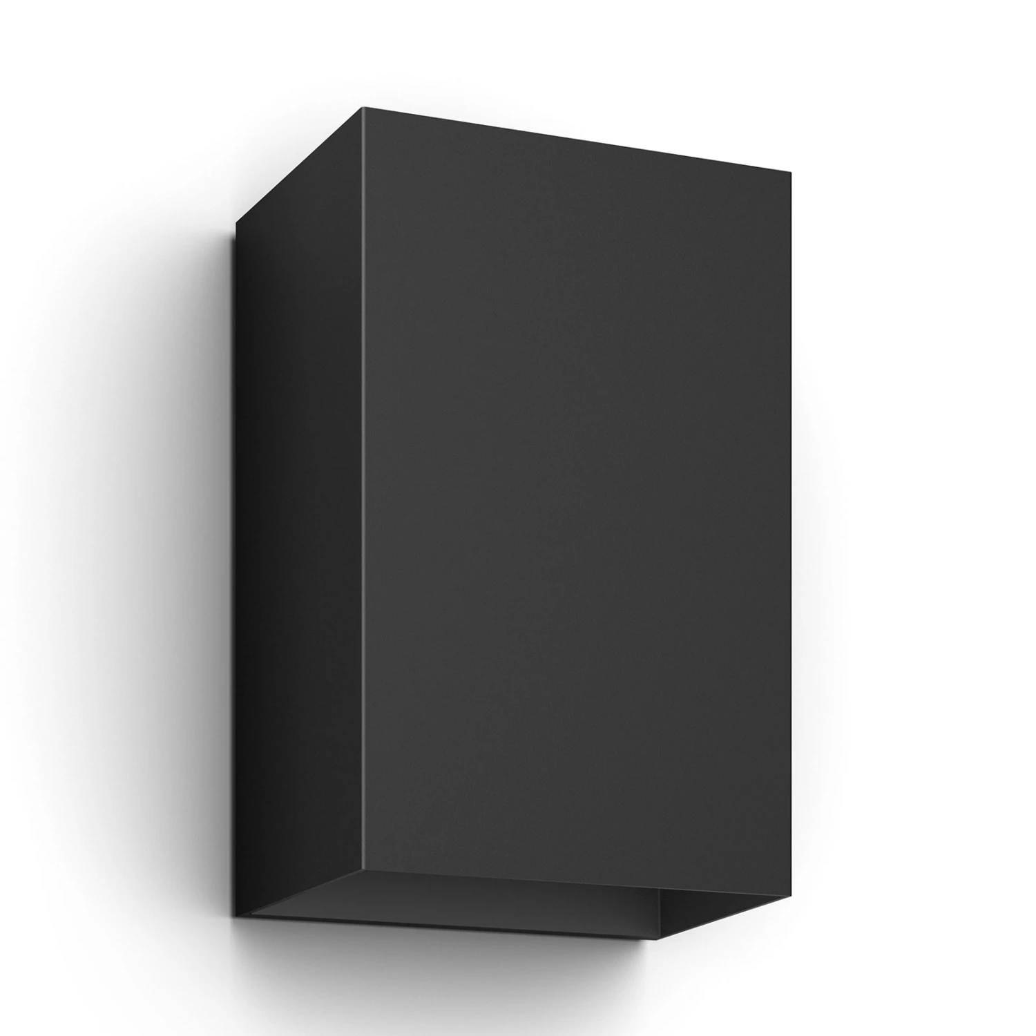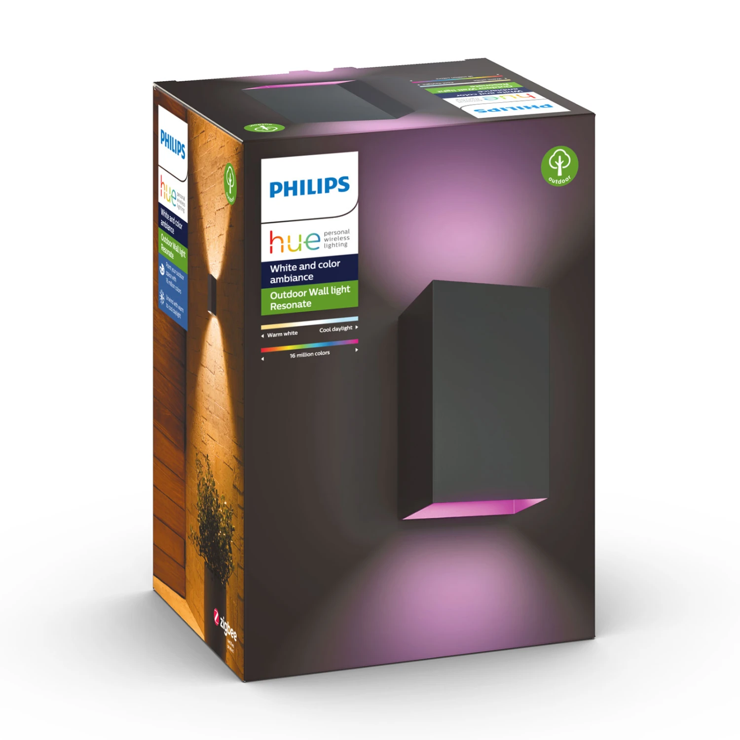 Cuboid LED outdoor wall lamp Philips Hue White and Color Ambiance Resonate – for white and colorful accent lightingMade of aluminum, the up-and-down Resonate wall lamp blends inconspicuously into modernly designed outdoor areas with its cuboid and black design. All the more eye-catching is its light, which can serve as white orientation lighting or colorful decoration.To use it, integration via a bridge (see accessories) is necessary. This opens up the world of smart lighting using Philips Hue, such as configuration via app, scene integration with other smart equipment elements (for example, motion sensor – see accessories) or use in other ZigBee-based systems, so that convenient control via voice command is also possible. White tones from 2,000 to 6,500 K and 16 million colors leave nothing to be desired.Technical data / compatibility:- controllable and dimmable via the Hue app- warm white (2,000 K) to daylight white (6.500 K)- 16 million colors for impressive outdoor lighting- compatible with existing Philips Hue system- voice control possible with Amazon Alexa, Apple HomeKit and Google Assistant- networkable with the motion detector Hue Outdoor Sensor (see accessories)- compatible with Hue Sync – light in harmony with music- a connection with the Hue Bridge is required (see accessories)Note: For the smooth functioning of the Hue outdoor lighting, the first outdoor light should be max. 10 m away from the bridge or a Hue lamp located inside. After that, all other lights should be installed at a distance of max. 20 m. However, the smaller the distance, the better.
