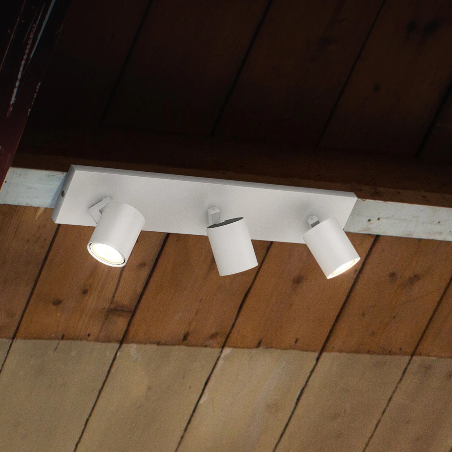 A white, elongated metal frame and three cylindrically shaped LED spots, which are already fitted with three White Ambiance GU10 LED lamps on delivery, form the LED ceiling spotlight Runner. The integrated Hue lamps have the innovative ZigBee standard, so that the connection to a smart home system is no problem.