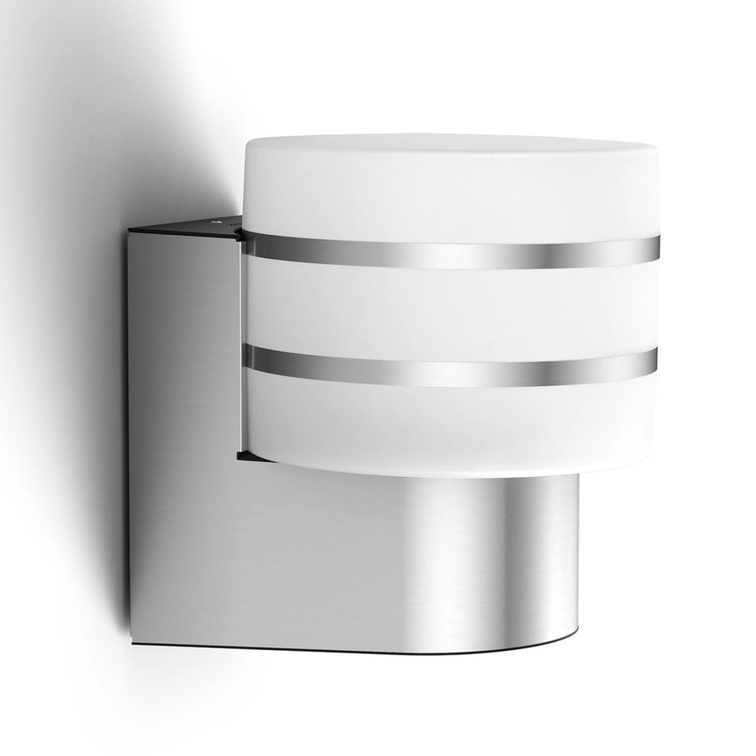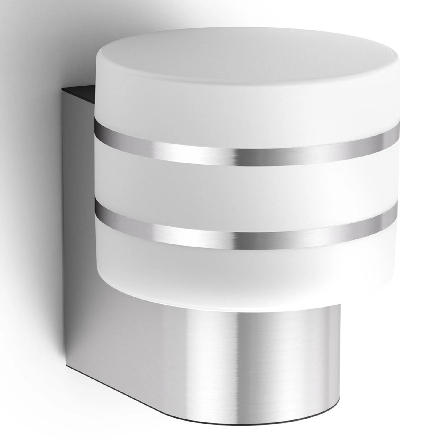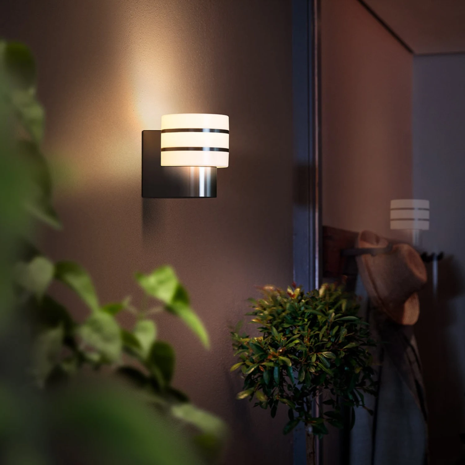 The Tuar LED wall light has a stylish stainless steel design and is equipped with a cylindrical lampshade, which spreads the warm white light of the Hue light bulb evenly into the surroundings. A real eye-catcher on your house façade.
