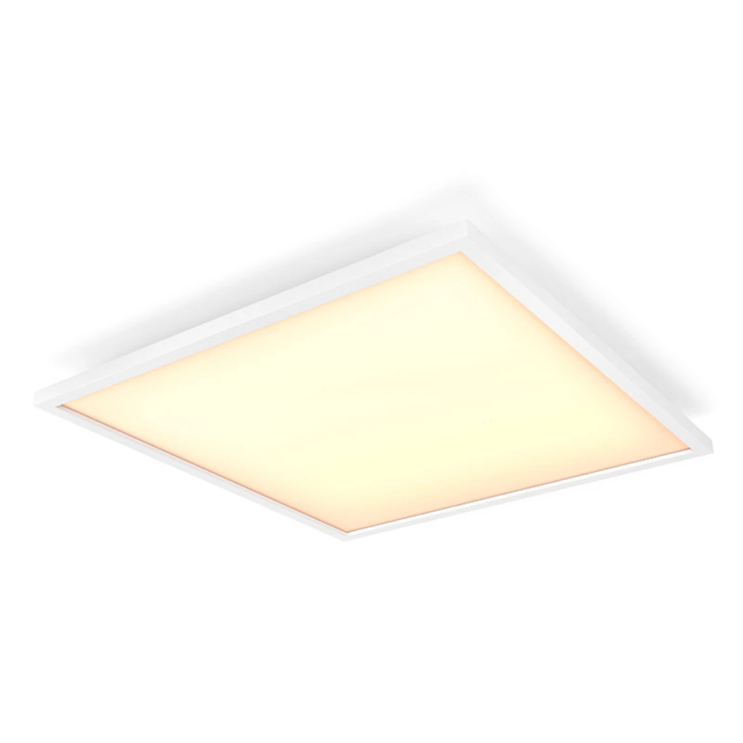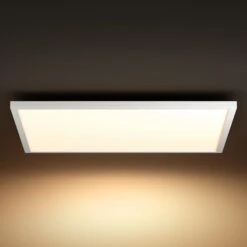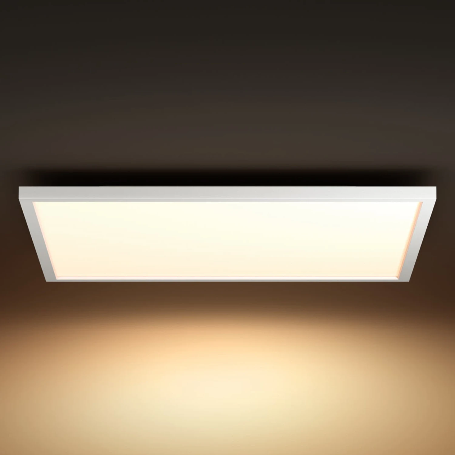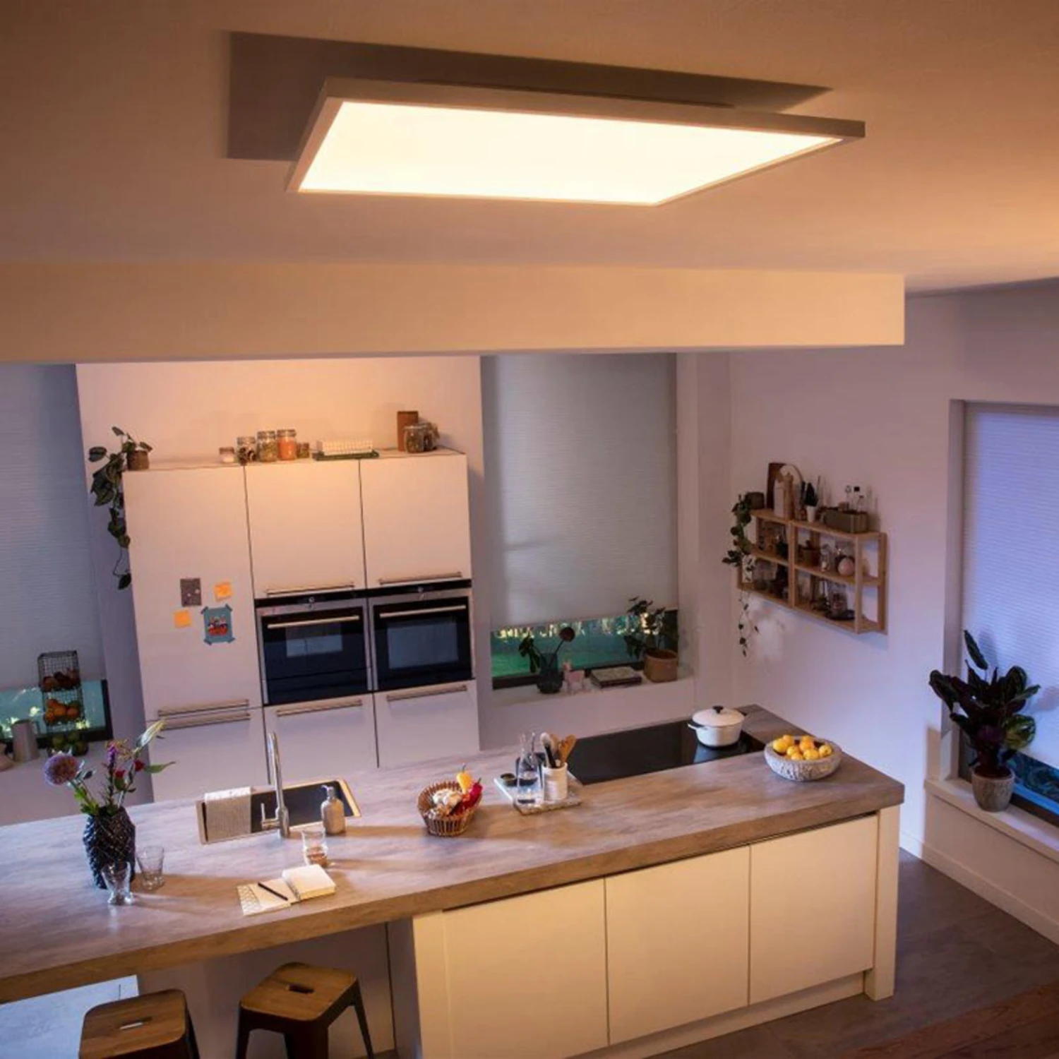 Angular Philips Hue LED ceiling panel Aurelle with White Ambiance functionWhether warm white light for cosy TV watching or powerful daylight for concentrated work in the kitchen – the Philips Hue LED ceiling panel Aurelle ensures the perfect ambience at all times. It can not only be switched to different brightness levels or light temperatures, but also to different modes – either via the supplied dimmer switch, which already has four pre-installed light recipes, or via app with the smartphone or tablet. Thanks to the flat design, the panel is ideal for use in rooms with low ceiling heights.Features / Compatibility- Control via Hue dimmer switch (included)- Controllable with matching Hue app (ZigBee) and Hue Bluetooth app- Adjustable colour temperatures: warm white (2,200 K) to daylight (6.500 K)- intelligent light control Option a: ZigBee integration via bridge and router, such as the Philips Hue Bridge (see accessories); this enables control locally or on the move via the Hue app and the option of voice control via Amazon Alexa, Apple HomeKit (Siri) and Google Assistant. – smart lighting control option b: Direct on-site control via Bluetooth with free Hue Bluetooth app. When using more than ten lamps within the Bluetooth control, the use of a bridge is recommended. Note: Not all functions are available when operating via the dimmer switch.