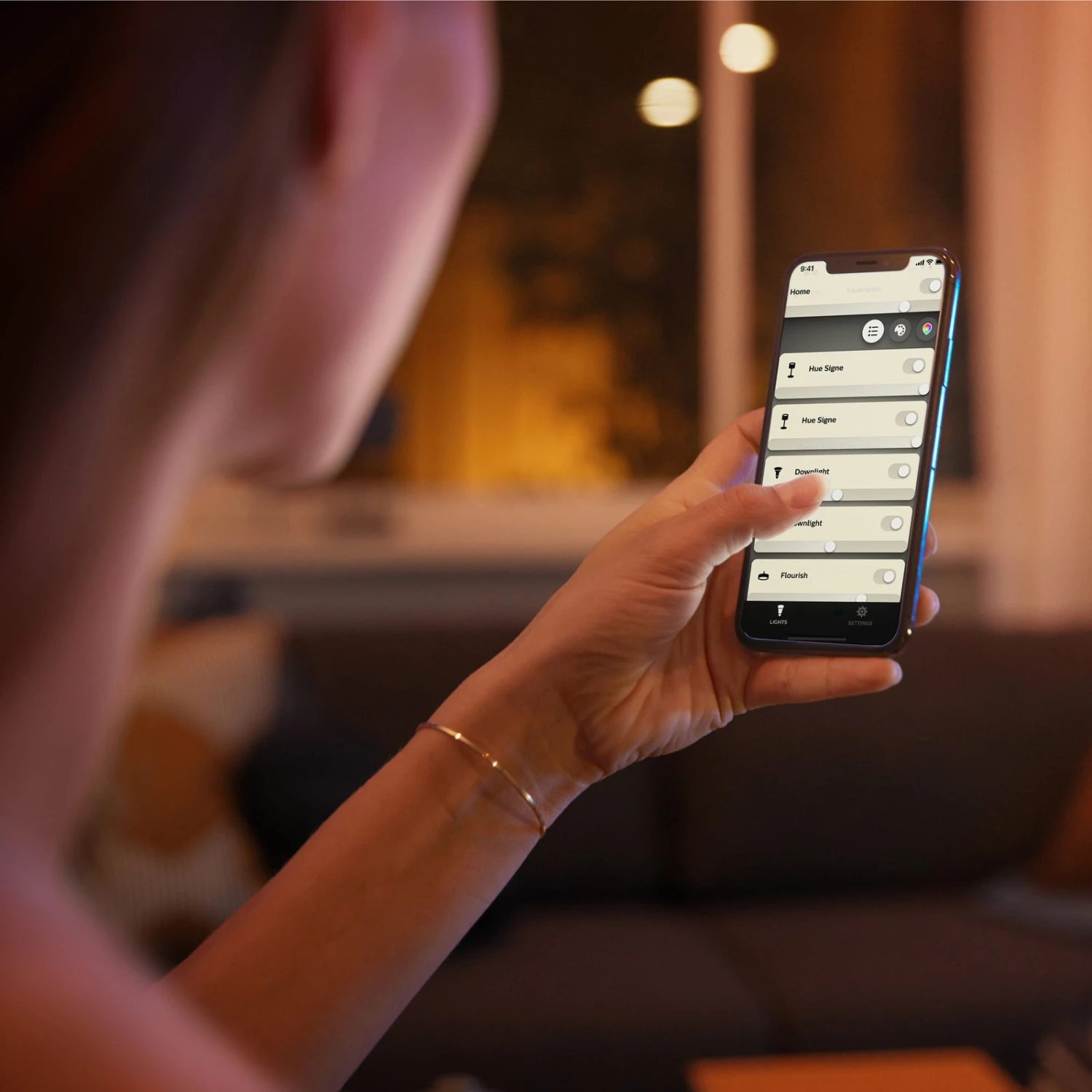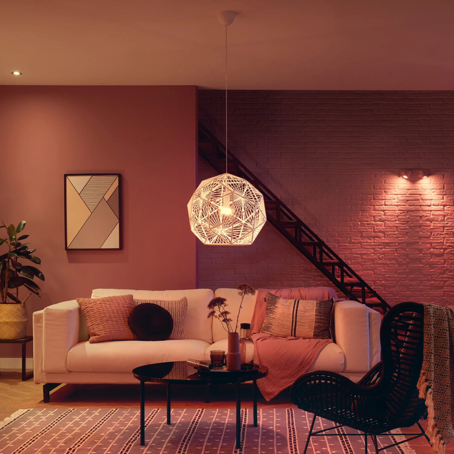 The Philips Hue White Ambiance LED lamp offers different white tones and dimmable light. It can be controlled in various ways, for example via the Hue dimmer switch (see accessories), which allows switching, dimming and the selection of pre-programmed lighting scenes. In addition, smart operation is possible, either directly coupled via Bluetooth with the smartphone/tablet or integrated into a smart home system via a ZigBee bridge.