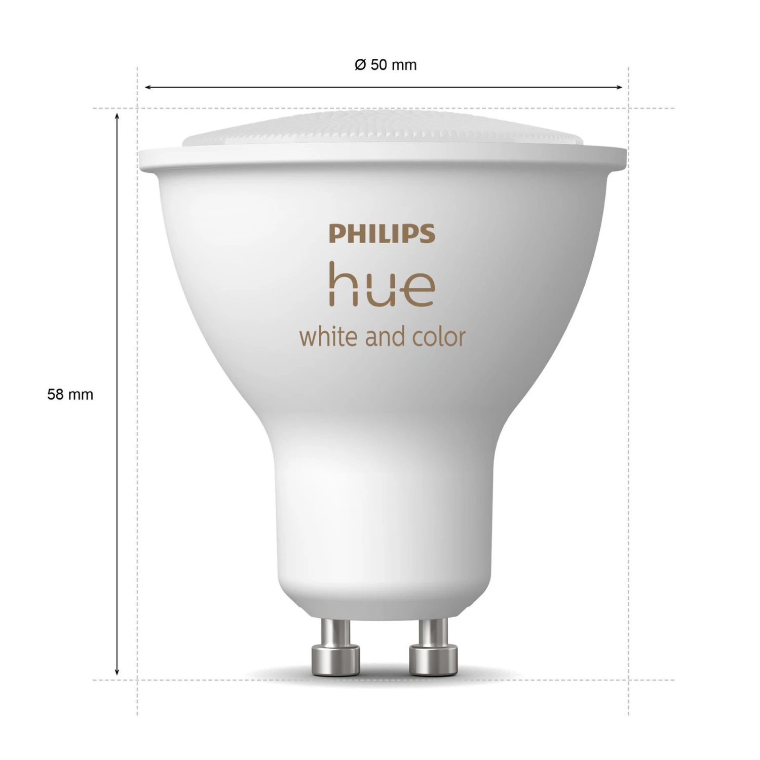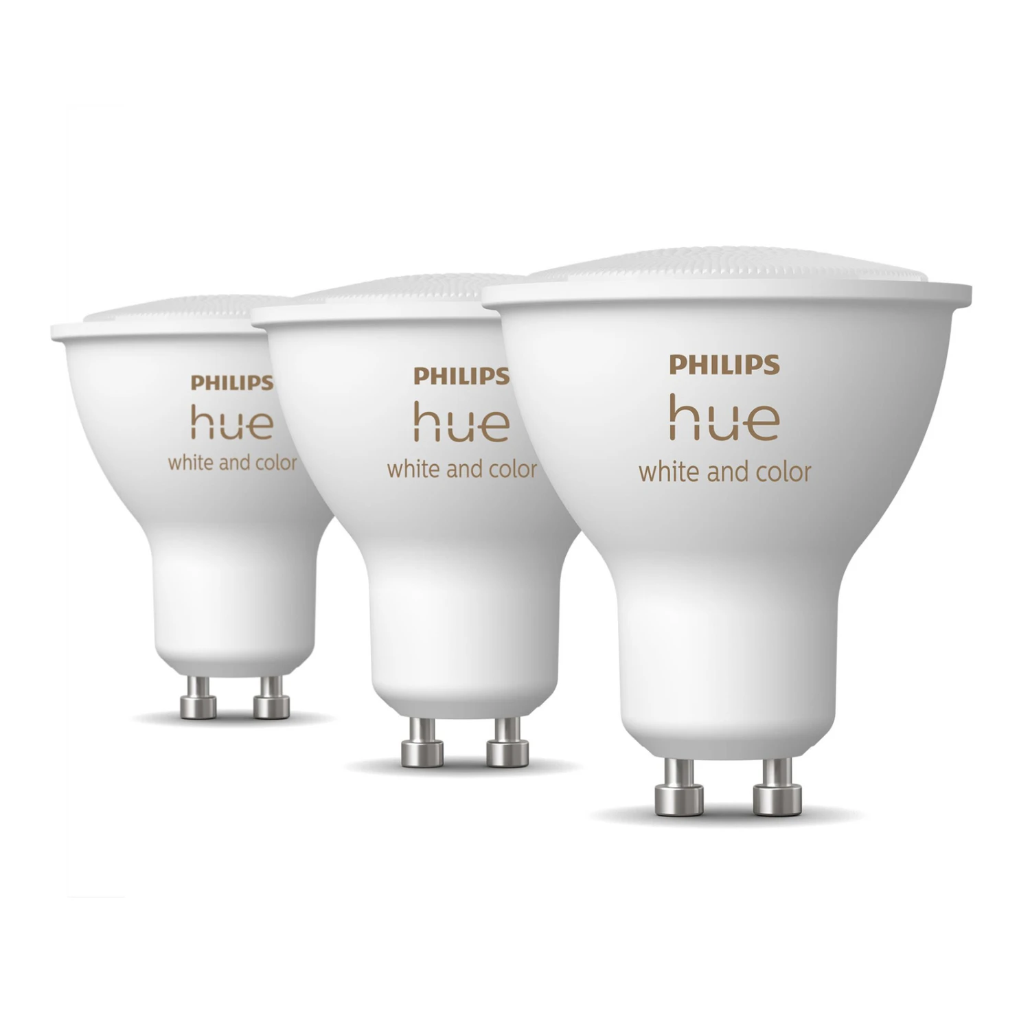 GU10 LED reflector Philips Hue White and Color Ambiance, 5.7W, in a set of 3This set of three Philips Hue GU10 LED lamps is the perfect choice to create a versatile, smartly configurable lighting experience in any light color and brightness with conventional luminaires with the appropriate receptacle. The LED lamps are both Bluetooth and ZigBee enabled, so they can be controlled directly with the Hue dimmer switch or smartphone/tablet. In addition, smart integration via ZigBee bridge is also possible to open up the whole world of smart lighting control in automated scenes, schedules, etc.Specifications:- 3-pack- 50,000 shades of white- 16 million colors- Bluetooth indoor range approx. 10 mSpecial features / compatibility:- controllable with the Hue dimmer switch (see accessories)- controllable with matching Hue app and Hue Bluetooth app- compatible with existing Philips Hue system and other ZigBee-based systems such as from Innogy, Bosch, Telekom (Magenta) and Busch-Jäger- voice control possible with Amazon Alexa, Apple HomeKit (Siri) and Google Assistant- Dimmable via app, voice command and dimmer switch- Light control via ZigBee – Integration into an existing smart home system via a bridge (for example Philips Hue Bridge, see accessories). Full scope of use including automations or control on the go (internet connection required).- Light control via Bluetooth – direct control on site with free Bluetooth app. When using more than ten lamps, the use of a bridge is recommended. In Bluetooth mode, the functions on/off/dimming and preset scenes can be used.