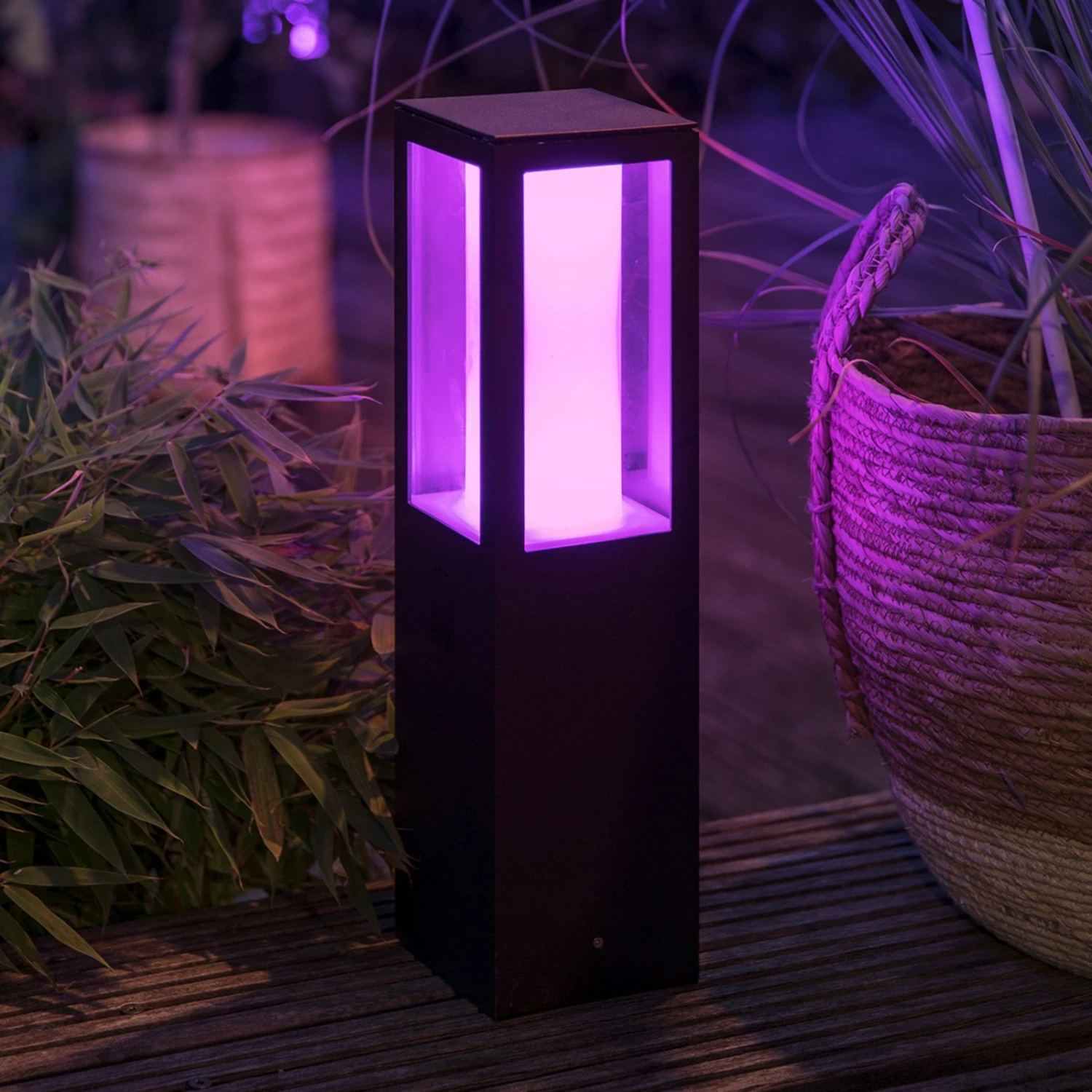 The Impress LED pillar light from Philips Hue makes an effective light in attractive colours or in a wide variety of shades of white possible. The integrated LEDs can be conveniently connected to the Hue smart home system and can be controlled, dimmed and managed via the corresponding app. This allows you to showcase your garden very easily with the lighting, without any major effort. It is helpful that several lights in different areas can be put together in groups and can be controlled with just a tap of your finger on your smart phone or with a simple voice command.