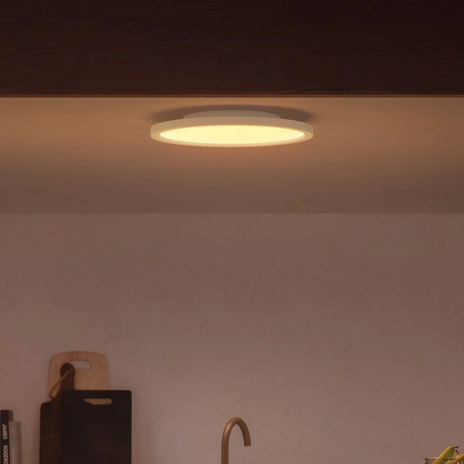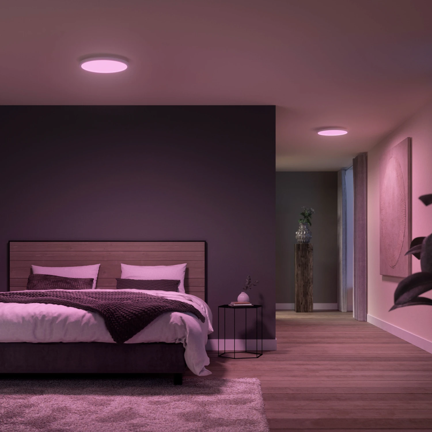 Round Philips Hue White & Color Ambiance LED panel Surimu with RGBW functionWhether you’re relaxing or watching TV, the smart lighting from Philips Hue enhances everyday moments and makes them extra special. Perfect for living rooms and bedrooms, the round Philips Hue White and Color Ambiance Surimu panel light is easy to install. With it, the home shines in soft and colourful light. It sits flush with the ceiling and fills the room with colour with its subtle look.16 million colours and various cool to warm white tones are available to create the right mood for every moment. For immediate use, the lamp can be paired with a smartphone or tablet via Bluetooth and controlled from there. Alternatively, it is possible to connect Surimu to an existing Hue Bridge control centre to enjoy the full functionality of the Philips Hue lighting system throughout the home and get even more out of the smart lights.Special features / compatibility- controllable with the Hue dimmer switch (see accessories)- dimmable (via app or dimmer switch)- controllable via ZigBee or Bluetooth and matching app- voice control possible with Amazon Alexa, Apple HomeKit (Siri) and Google Assistant- compatible with other ZigBee-based systems in addition to Philips Hue- light control via Bluetooth – up to ten luminaires and lamps directly controllable with free Hue Bluetooth app without additional accessories.Functions: on, off, dim, preset light scenes Light control via ZigBee – integration via bridge and router into a Smart Home system, such as Philips Hue (bridge see accessories). Versatile functions can be used here, including control while on the move, creating and using schedules and programming individual scenes and automations.