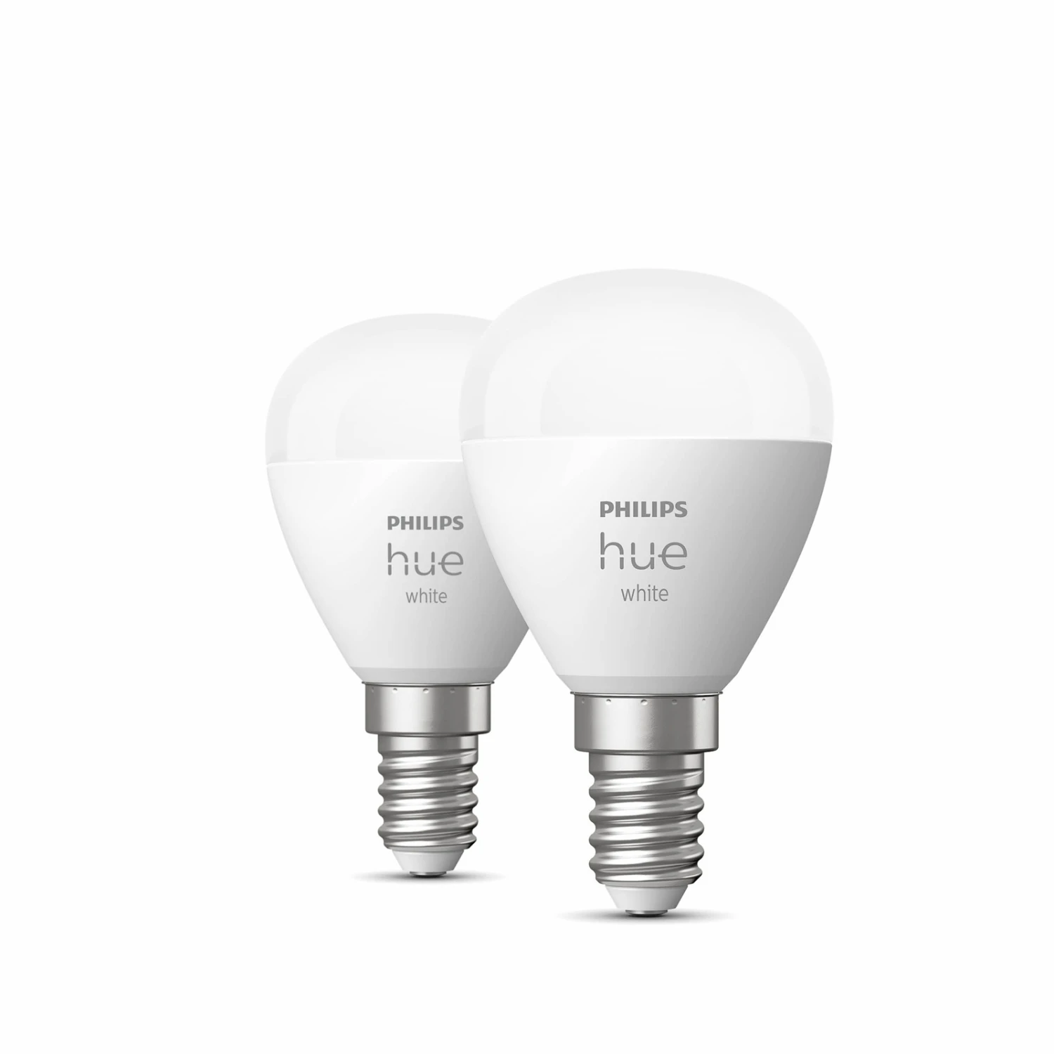 Philips Hue White E14 drop bulb with warm white light colour, 5.7W in a practical set of 2