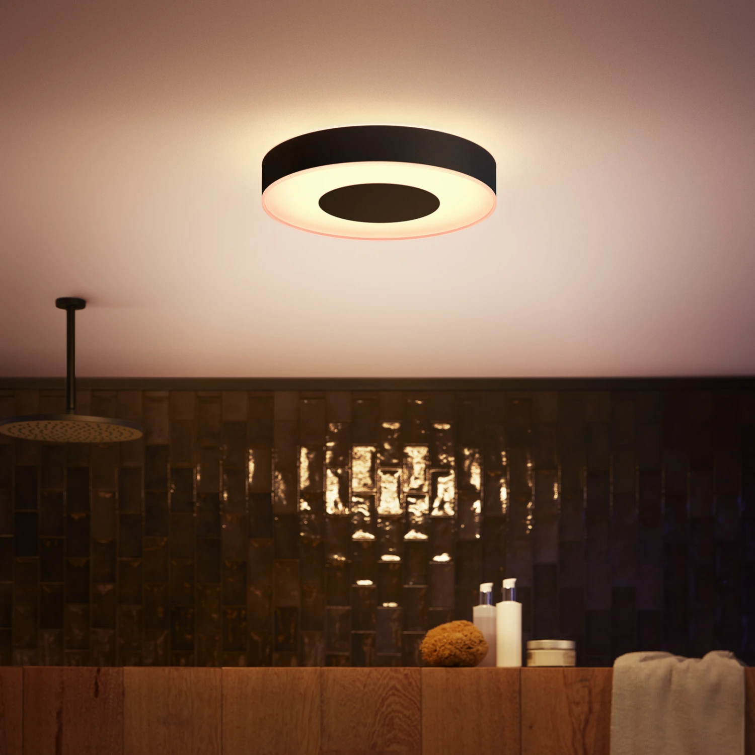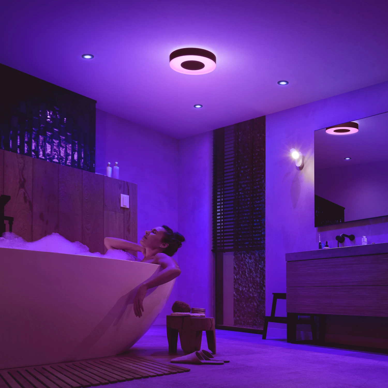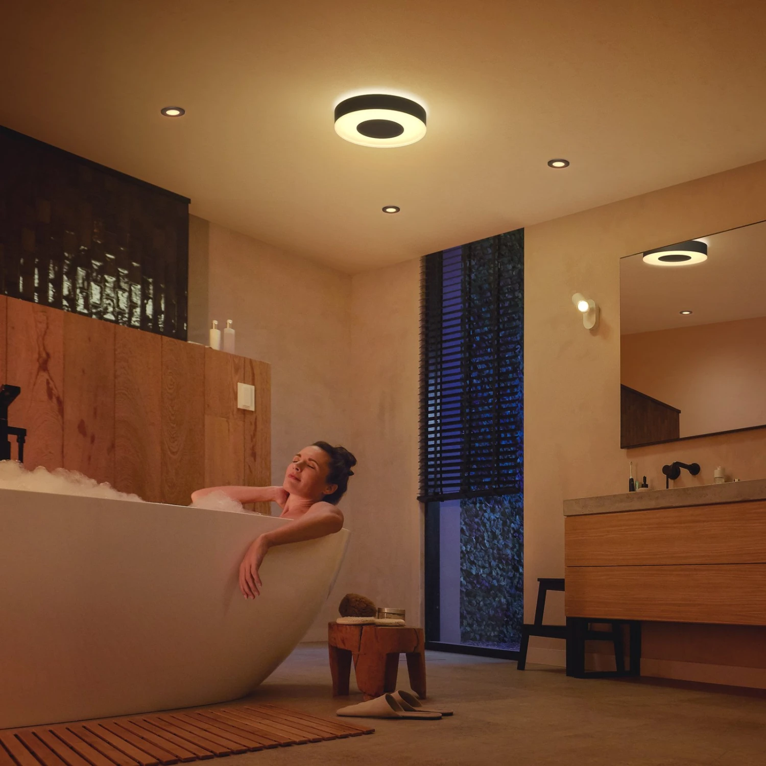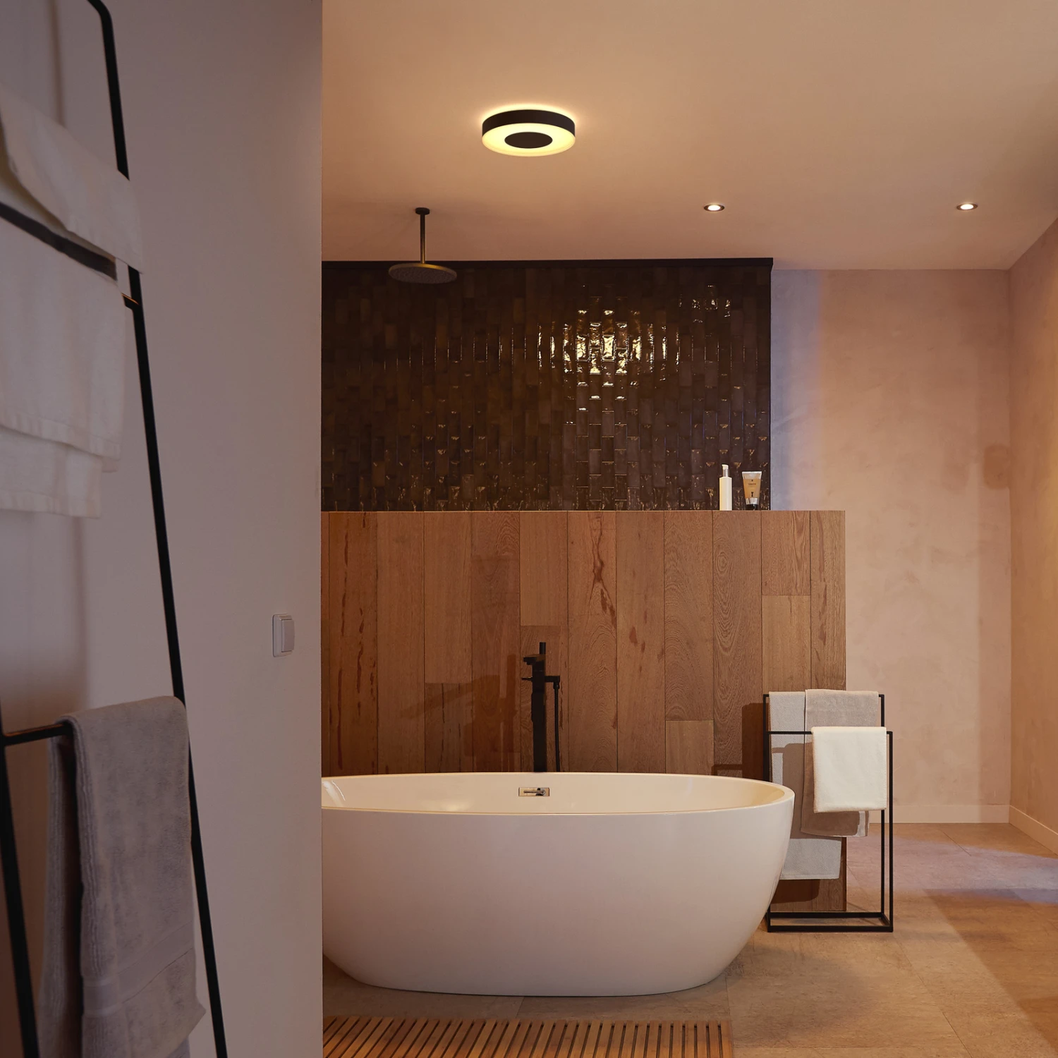 Black bathroom ceiling lamp Xamento creates atmospheric accentsThe LED ceiling lamp Xamento in a round design and with a black frame has integrated LEDs with White and Color Ambiance technology, through which it is possible to choose between numerous bright colors, as well as white gradations from warm white to daylight. Thus, individual requirements for lighting conditions in a wide variety of rooms are served. Thanks to IP44 protection, Xamento can also be ideally used in the bathroom.The ceiling lamp can be operated, for example, childlight with the separately available Hue dimmer switch. In addition, via Bluetooth a direct control with the smartphone / tablet can be made, for which only the Hue Bluetooth app is necessary. This opens up new possibilities such as the free control of the light color. In order to be able to use all functions fully and to have even more settings available, the possibility is offered to connect the product with ZigBee and a Hue Bridge (see accessories). This gives the user access to automations, schedules, groups and much more to control its products together smart.Features / Compatibility- Protection class: IP44- dimmable (via app, dimmer switch or voice command)- adjustable light color (warm white to daylight, 16 million. colorful gradations)- compatible with existing Philips Hue system- controllable with matching Hue app (in combination with Hue Bridge) and Hue Bluetooth app (directly with smartphone/tablet)- compatible with other ZigBee-based systems, such as Innogy, Bosch, Magenta (Telekom) and Busch-Jäger- intelligent lighting control option a: ZigBee integration via bridge and router, such as the Philips Hue Bridge (see accessories); this enables control on site or on the go via Hue app and the possibility of voice control via Amazon Alexa, Apple HomeKit (Siri) and Google Assistant.- smart lighting control option b: Direct on-site control via Bluetooth with free Hue Bluetooth app. When using more than ten lamps within Bluetooth control, the use of a bridge is recommended.